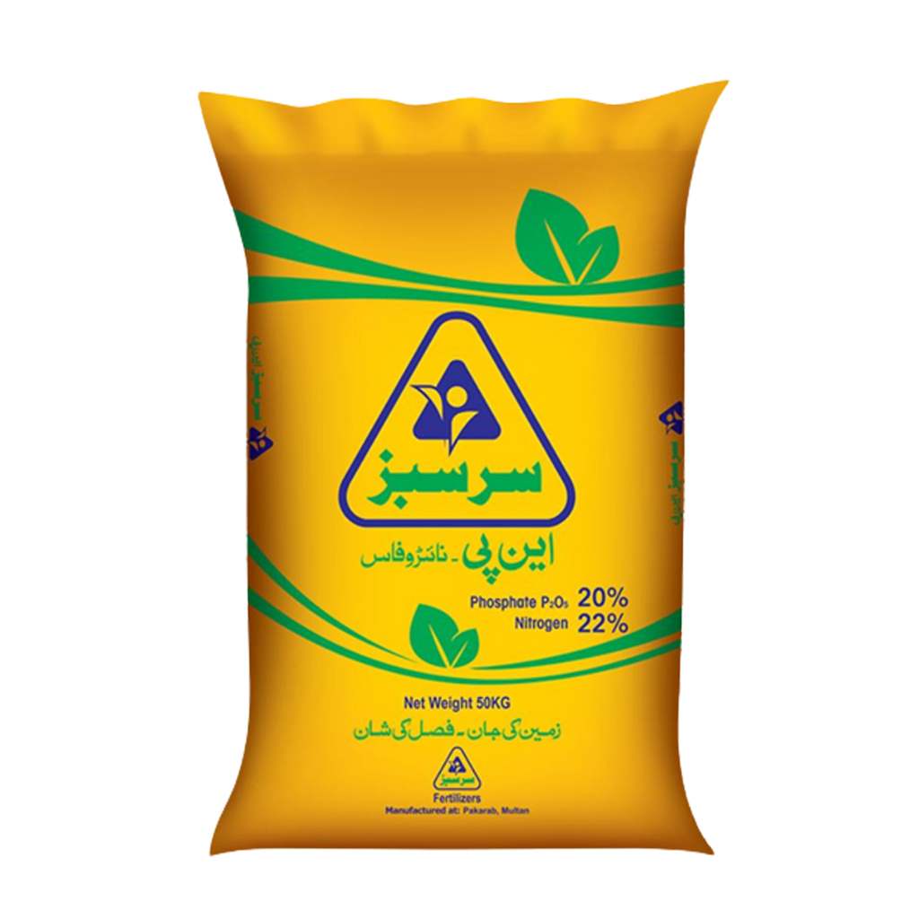 Sarsabz Nitrophos 50KG (NP Fertilizer) is a premium granulated fertilizer containing 22% Nitrogen (N) and 20% Phosphorus (P) in every grain, ensuring uniform nutrient distribution across fields.